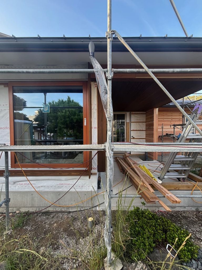外壁は杉板張りと塗り壁の施工待ち。