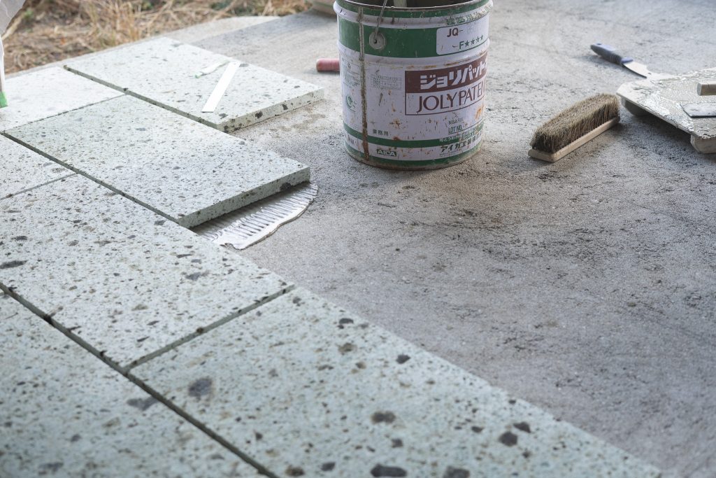 床は大谷石貼り。今回は目地を広め(10mm)にとって馬目地張り。