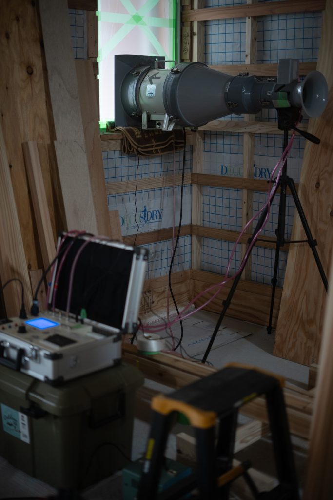 機械で建物内の空気を強制的に外に排出し、内外の圧力差と風量から隙間面積を計算し、C値を算出。