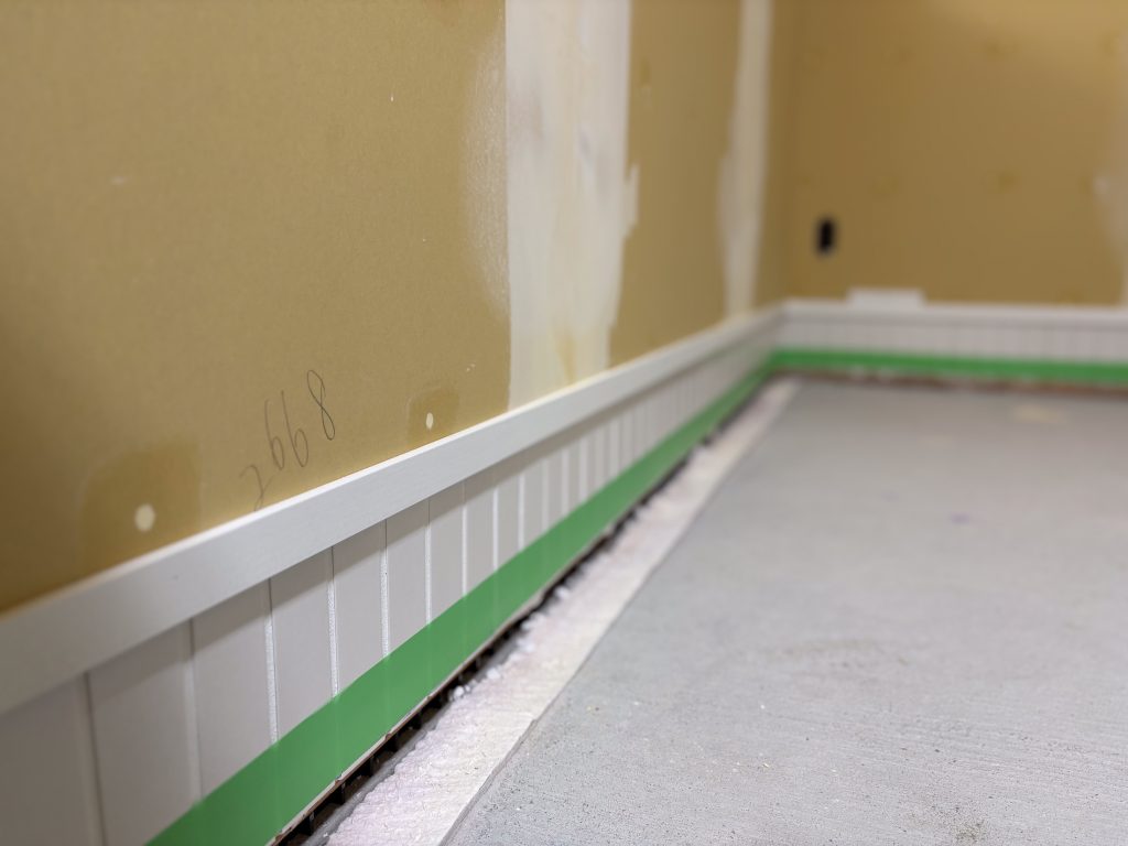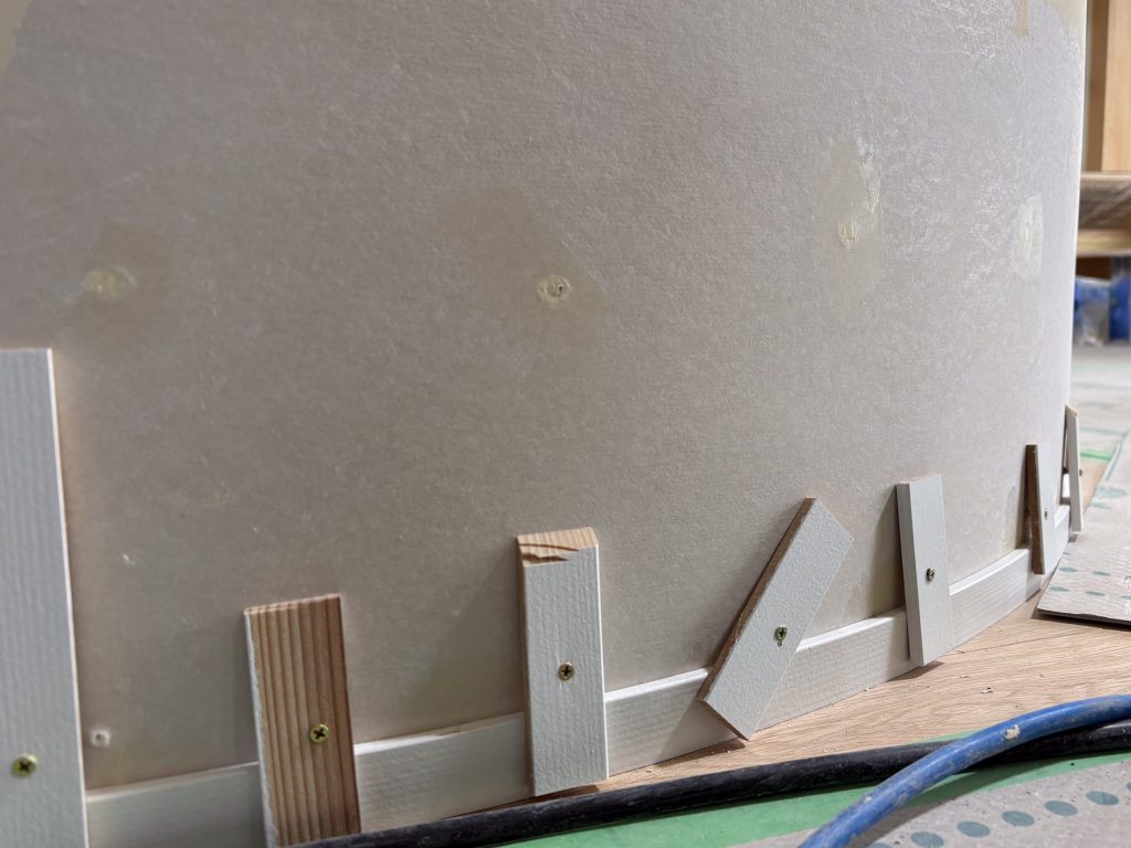 曲線に沿った巾木と仮止めの群れが、大変さと丁寧なお仕事ぶりを物語ってます。