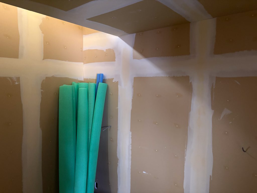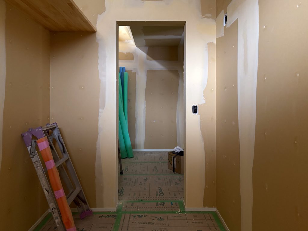 ボードを張った後は、ビスの後やボードの隙間をパテで埋め、丁寧に不陸をなくしていきます。